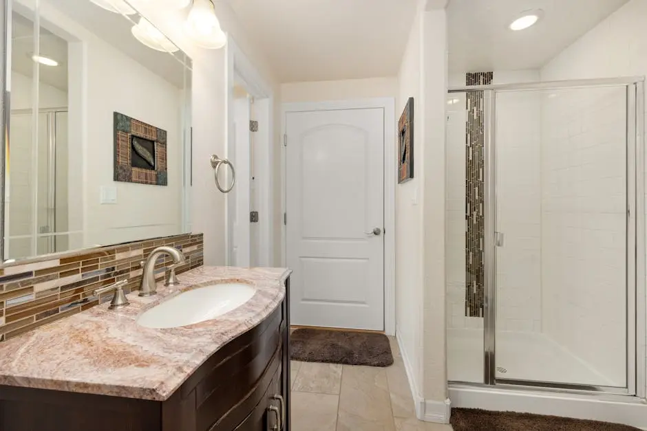 Contemporary bathroom design featuring granite sink countertop and glass shower enclosure.